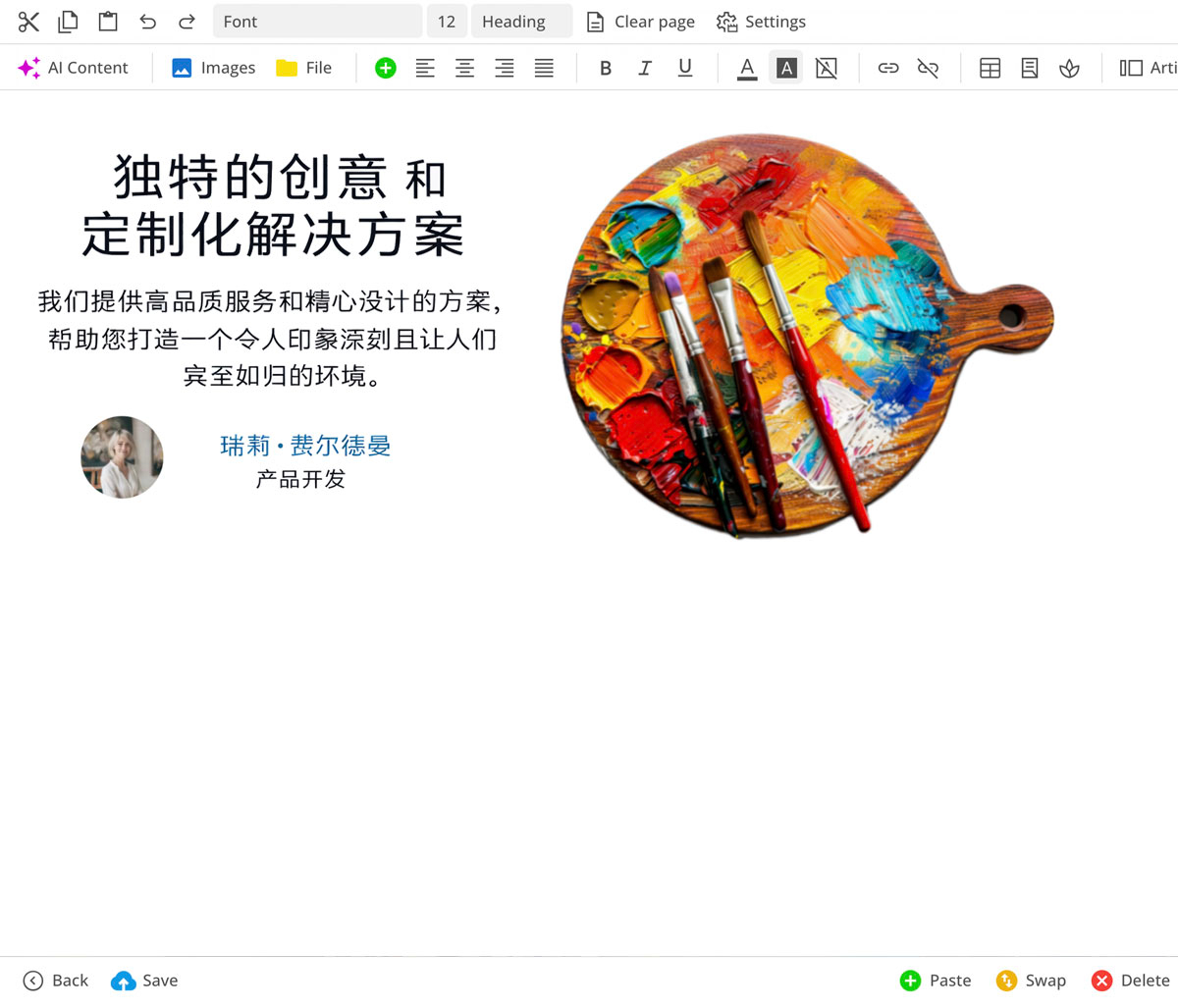 Opcionalmente, el editor puede restringirse para que solo se cree contenido conforme al diseño – sin colores incorrectos, espacios inusuales o rupturas de diseño.