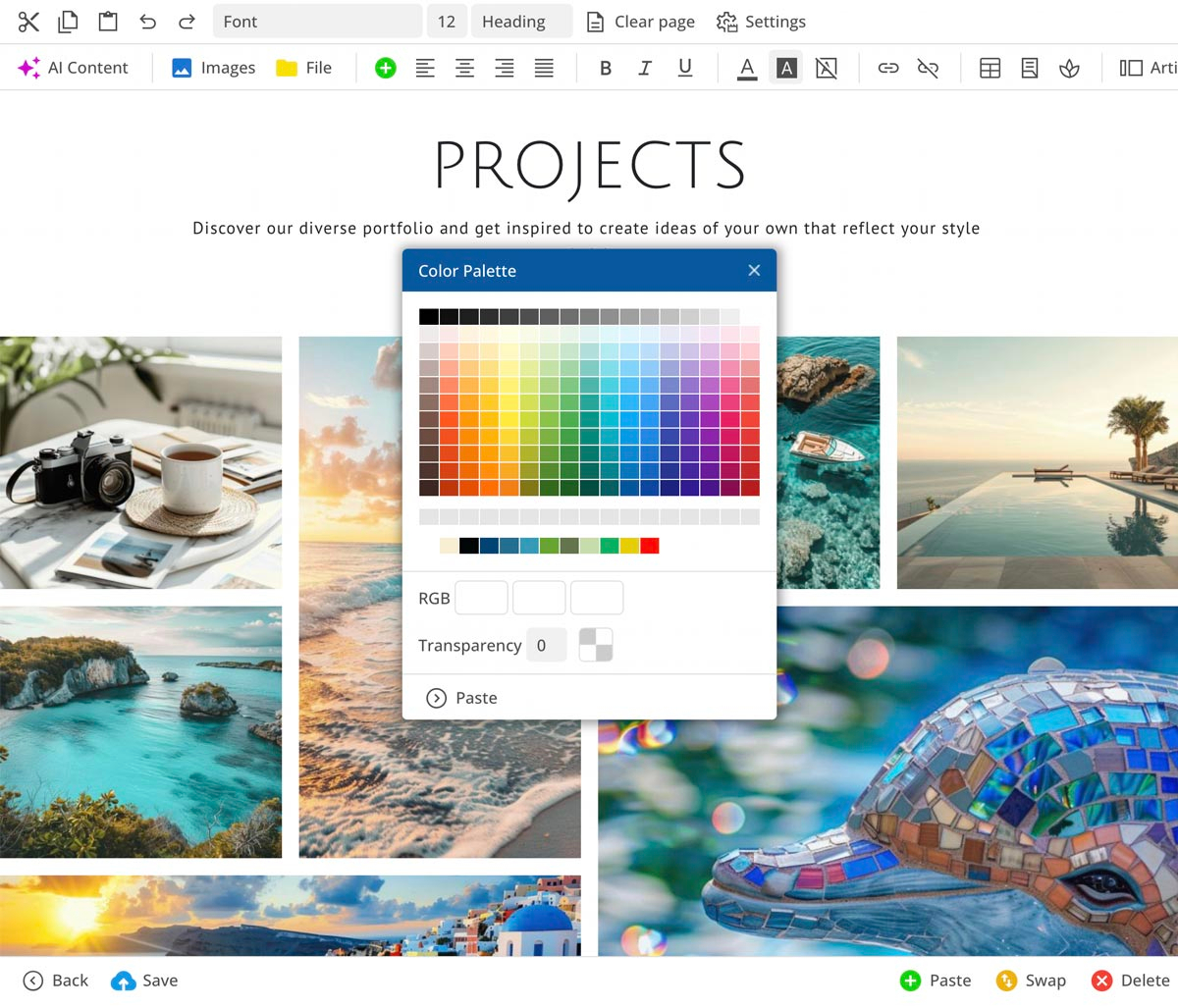 El editor te proporciona diferentes plantillas de secciones de página que están exactamente ajustadas al diseño elegido. Una IA integrada ayuda a generar y optimizar textos.