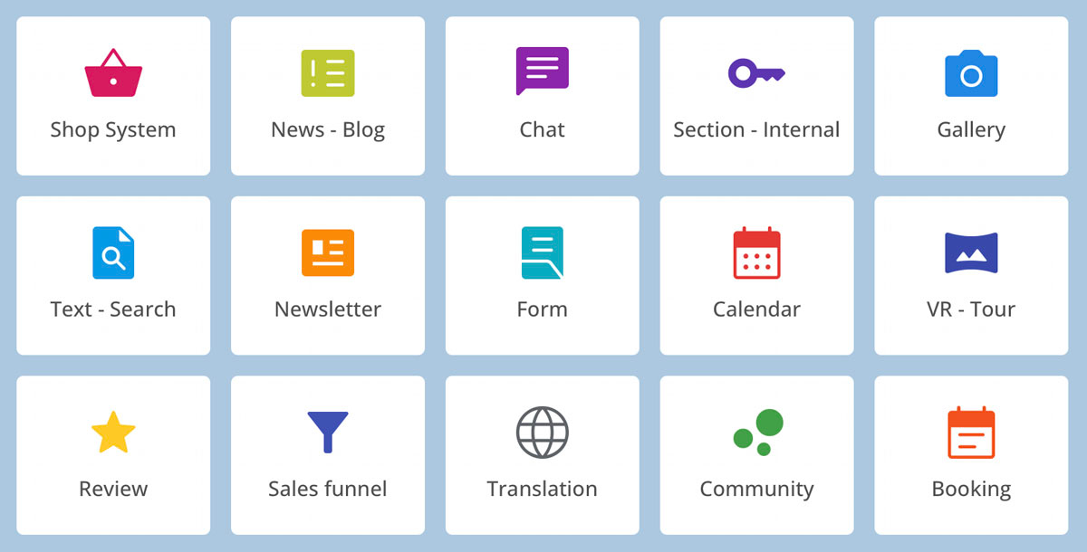 Sistema de tienda, noticias, blog, chat, áreas de la web protegidas por contraseña, galería, comunidad, búsqueda de textos, boletín, formulario, calendario, reserva, traducción y evaluación.