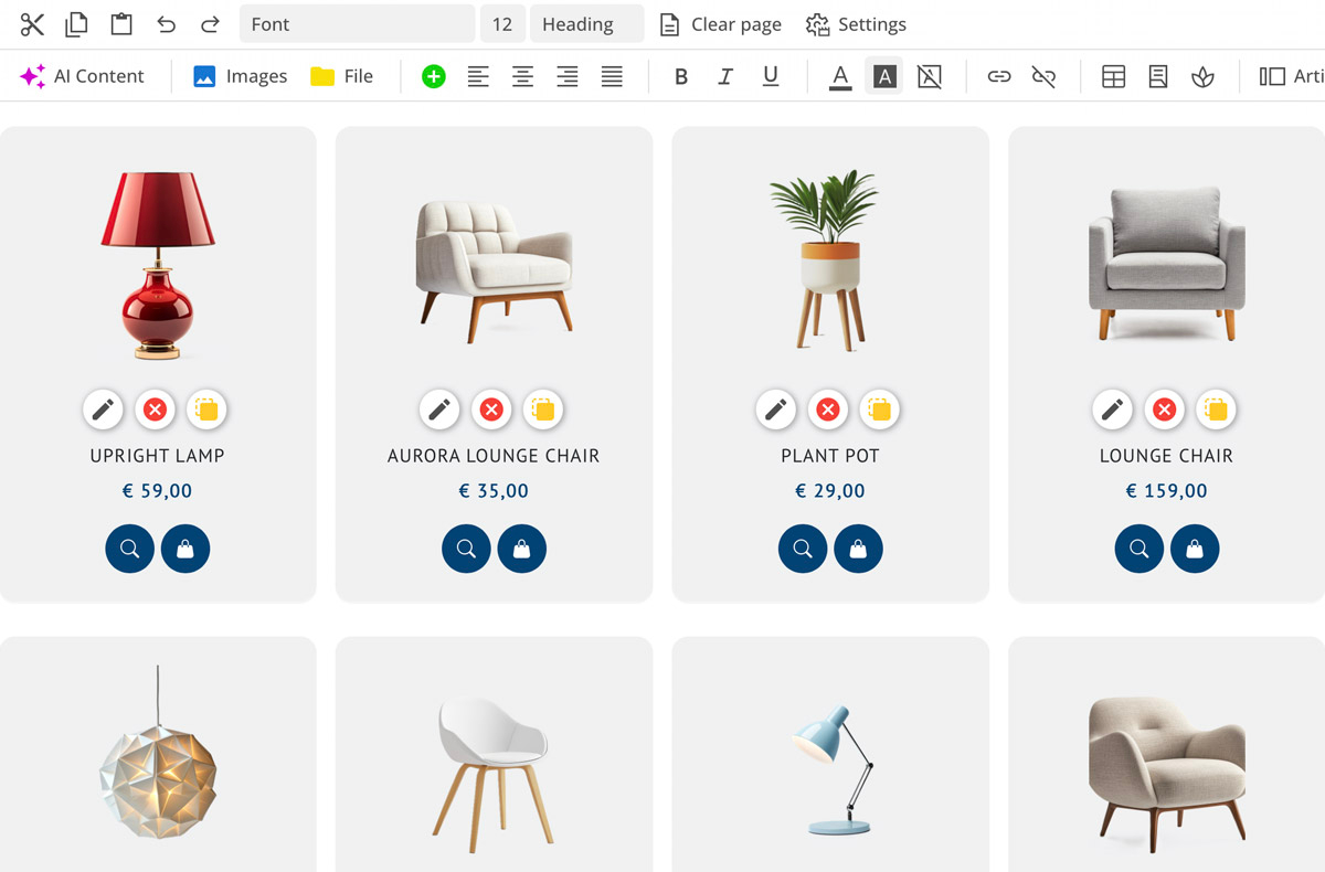 Se pueden importar listas de artículos y asignar imágenes automáticamente. También se puede traducir la tienda en línea con la ayuda de IA en hasta 24 idiomas.