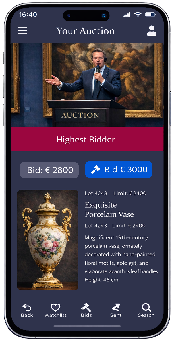 Con la consola de la casa de subastas puede transmitir subastas clásicas de sala adicionalmente a Internet: de manera sincronizada y verificable. Los empleados de su casa de subastas operan la consola y transmiten los pasos de puja, las adjudicaciones y los cambios de lote en tiempo real. Los pujadores en línea pueden seguir la subasta por video y realizar pujas en vivo a través de la página web o la app, y pueden ofertar sin retraso como si estuvieran directamente en la sala. También se pueden implementar, por ejemplo, pasos de puja ocultos mediante pujas automáticas de agentes de puja. El pujador en línea ve en todo momento si actualmente es el máximo postor, si la puja líder proviene de la sala o, en su caso, ha sido realizada a través de una consola en vivo externa, y puede aumentar su puja en cualquier momento.