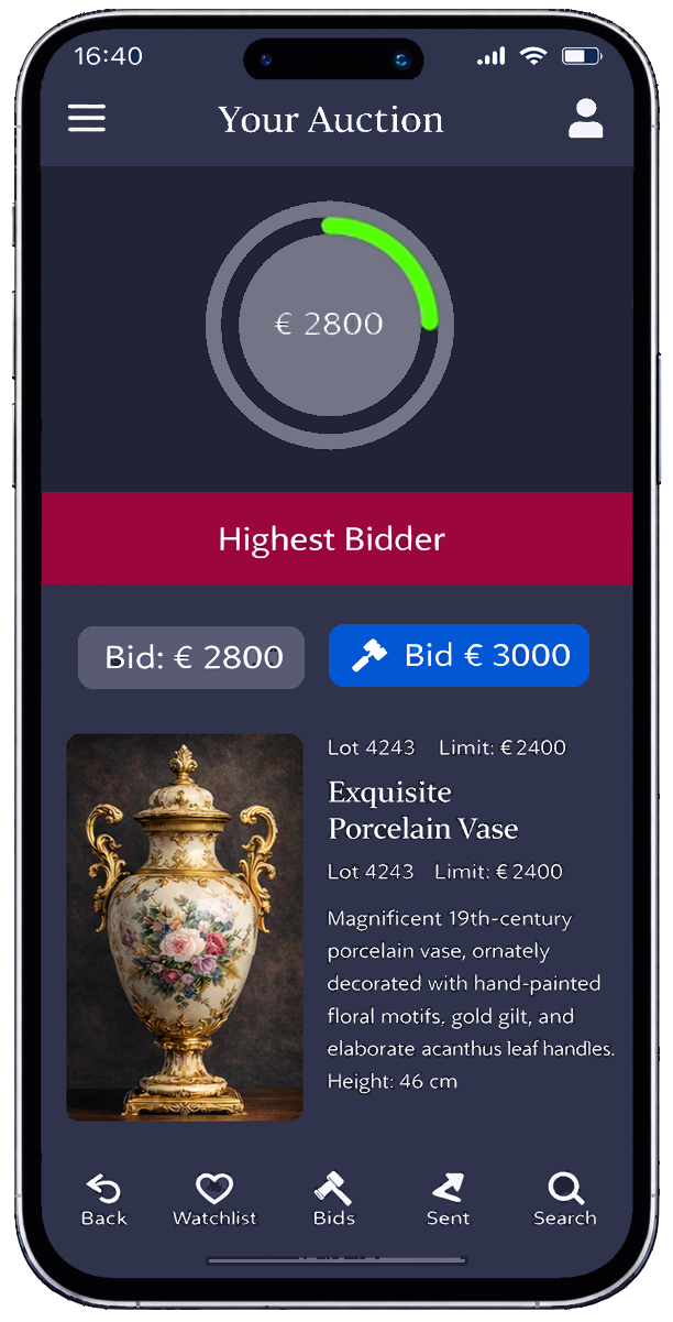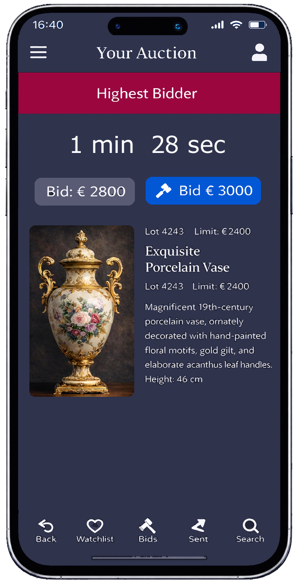 Si utiliza la app, los postores recibirán además alertas push, por ejemplo, al hacer una oferta, ser superados, ganar una subasta o poco antes de que expire un lote. Esto aumenta considerablemente la participación, ya que el usuario no tiene que "revisar" constantemente, sino que recibe recordatorios en el momento adecuado.