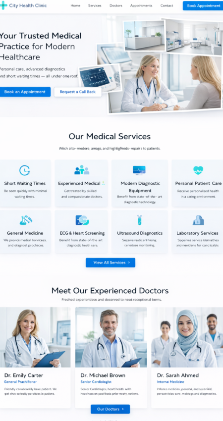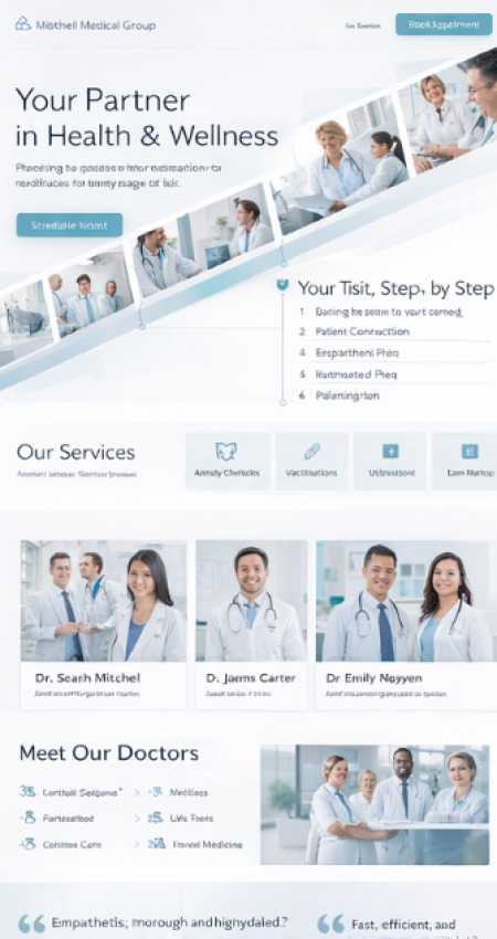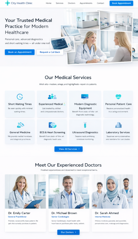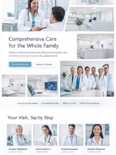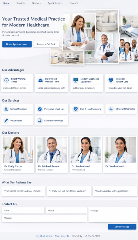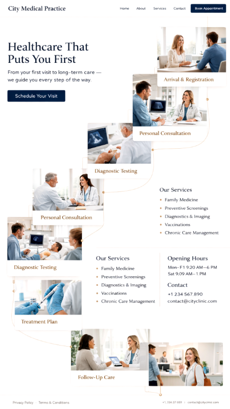 Presente su práctica de forma profesional: áreas de especialización, oferta de servicios, equipo, ubicaciones, horarios de atención y formas de contacto. Agregue citas en línea, formularios para nuevos pacientes e información clara sobre los procesos. Opcionalmente con área de noticias, multilingüismo, áreas protegidas para pacientes y páginas de documentos (por ejemplo, formularios de consentimiento, avisos, descargas).
