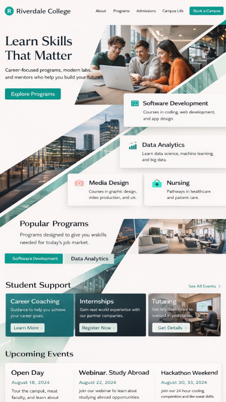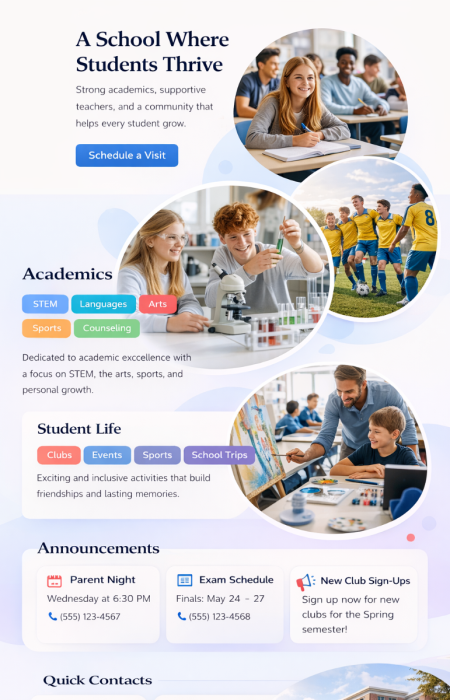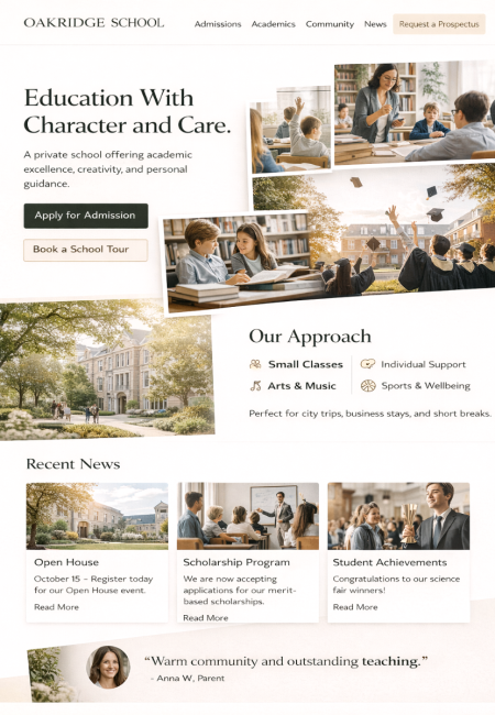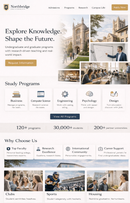 Presente su escuela o universidad de manera profesional: misión, contactos, áreas de estudio, fechas, descargas, ubicación. Las noticias se pueden mantener con un archivo, para que la información sea fácilmente encontrable a largo plazo. Las fotos de clases y proyectos pueden mostrarse como galerías – con aprobaciones y opciones de visibilidad por área. El resultado es moderno y permanece fácil de entender para los usuarios.