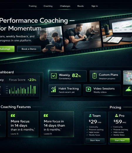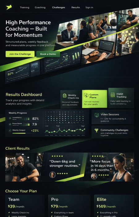 Una plataforma para coaches, estudios y entrenadores: transmisiones en vivo, cursos en video, reserva de citas, pagos, área de clientes y chat de IA. Diseñado para coaching individual, programas grupales y membresías recurrentes.